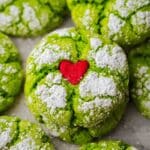 These vibrant Grinch Cookies are a fun and festive treat made with white cake mix, Cool Whip, and neon green food coloring. Soft and tender with a sweet powdered sugar coating and a charming red heart sprinkle on top, they’re perfect for holiday celebrations or any time you want to add a pop of color and whimsy to your dessert table.
