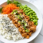 - Assemble the Bowls: In serving bowls, layer cooked rice and your choice of veggies such as shredded carrots, cucumbers, edamame, pickled onions, avocado, and shredded cabbage. Spoon the warm ground turkey mixture over the top, drizzle with additional Bang Bang Sauce, and garnish with sliced green onions and sesame seeds. Serve immediately.