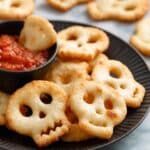 Crispy and festive Halloween Skull Chips made from flour tortillas, perfect for spooky celebrations. Choose between deep frying for puffed, golden chips or baking for a crunchy, lighter option. Served with a vibrant, spooky salsa dip, these chips are an easy and fun snack to delight guests of all ages during Halloween.