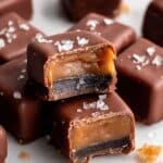 - Coat the Caramels: Dip each caramel square into the melted chocolate, ensuring it is fully coated. Place the coated caramels onto a lined plate or sheet of parchment paper.