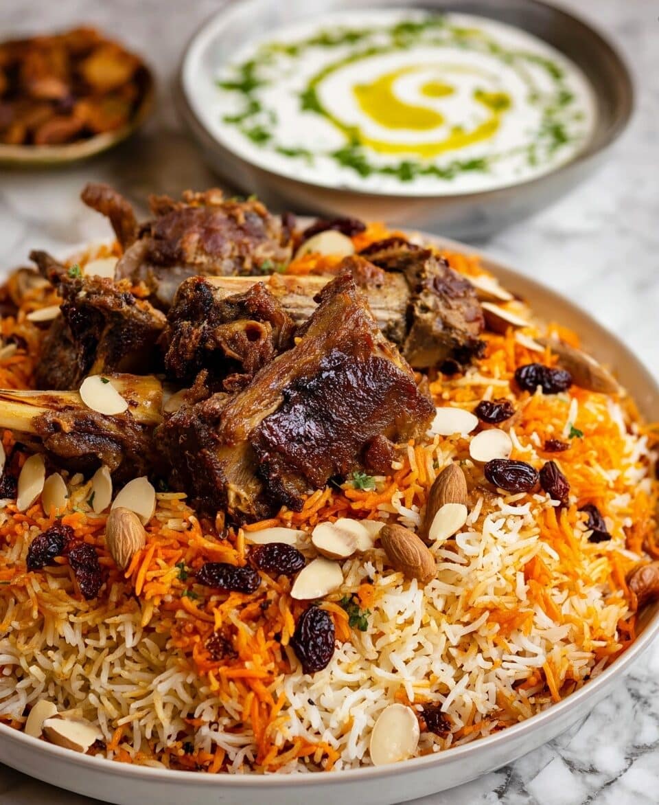 Kabuli Pulao is a traditional Afghan rice dish featuring aromatic basmati rice cooked with tender lamb shanks, whole and ground warm spices, and topped with caramelized carrots, raisins, and roasted almonds. This richly flavorful and fragrant pulao combines savory slow-cooked meat with subtly sweet garnishes, offering a perfect balance of textures and tastes representative of Afghan cuisine.