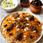 Keywords: Kabuli Pulao, Afghan rice, lamb pulao, basmati rice, Afghan cuisine, aromatic rice dish, caramelized carrots, roasted almonds