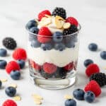 This creamy and refreshing Ricotta Dessert combines smooth ricotta cheese blended with lemon zest and sweetened with powdered monk fruit blend, layered beautifully with fresh raspberries, blueberries, and blackberries. Topped with optional sliced almonds and whipped cream, this no-bake parfait is an elegant, light treat perfect for a healthy dessert or snack.