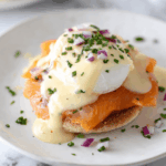 This lighter version of classic Eggs Benedict swaps out the rich hollandaise sauce for a tangy light sour cream sauce, paired with delicate smoked salmon and perfectly poached eggs over toasted English muffins. It’s a fresh, satisfying brunch option that’s both elegant and easy to prepare.