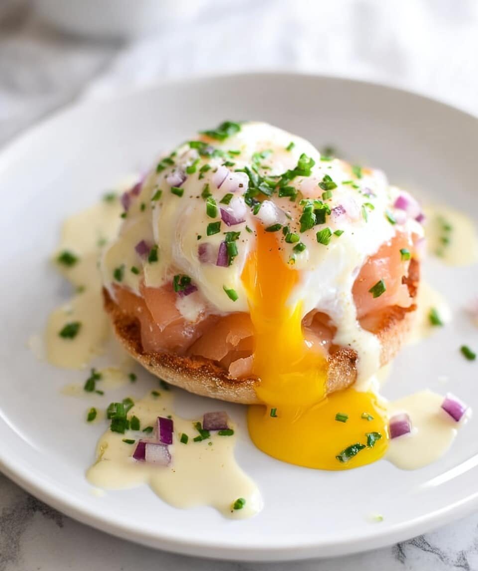 Enjoy a lighter twist on the classic Eggs Benedict by swapping hollandaise for a tangy sour cream sauce and adding smoked salmon for a flavorful, elegant breakfast. This dish is quick to prepare and perfect for a special morning treat.