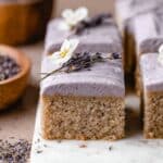 - Step 16: Spread a thick layer of lavender cream cheese frosting evenly on top using an offset spatula. Cut into 16 slices and serve.