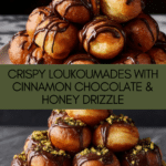 Loukoumades are traditional Greek honey puffs—light, airy fried dough balls that are golden brown and irresistibly crispy on the outside while tender inside. These delightful treats are drizzled with warm cinnamon-spiced melted chocolate and honey, then sprinkled with chopped pistachios for a perfect balance of sweetness and crunch. Ideal for a festive dessert or indulgent snack, these classic loukoumades bring a taste of Greece to your kitchen.