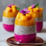 This vibrant Mango and Dragon Fruit Chia Pudding is a creamy, nutrient-packed parfait perfect for a healthy breakfast or snack. Made with chia seeds soaked in coconut milk, sweetened with maple syrup, and layered with smooth blends of pink dragon fruit and Alphonso mango, it’s a tropical delight that’s both visually stunning and delicious. Optional vanilla coconut yogurt adds extra creaminess, while fresh chopped mango on top enhances the fruity experience.