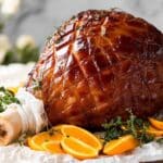 - Presentation Tips: Remove cloves before carving. For a festive look, wrap the bone handle with baking paper and ribbon, place ham on a platter decorated with greenery and additional orange quarters.