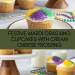 Keywords: Mardi Gras cupcakes, king cake cupcakes, cream cheese frosting, festive desserts, holiday cupcakes, colorful sugar topping