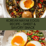 Keywords: Mayak Eggs, Korean marinated eggs, soft boiled eggs, Korean side dish, soy sauce eggs, marinated eggs, spicy eggs