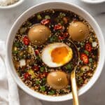 - Serve: Enjoy the marinated eggs served with freshly cooked rice, a spoonful of the marinade, and a drizzle of sesame oil for added aroma and flavor.