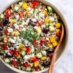 Keywords: Mediterranean quinoa salad, quinoa salad with vegetables, healthy quinoa recipe, lemon oregano dressing, feta cheese salad, cold quinoa salad, vegetarian salad