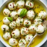 Merry Mozzarella Bites are a delightful appetizer featuring creamy cilingine cheese tossed in a vibrant mixture of extra-virgin olive oil, fresh herbs, tangy white balsamic vinegar, and a touch of crushed red pepper flakes. This simple yet flavorful dish is perfect for festive gatherings and easy entertaining.