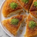 Keywords: Kunafah, Middle Eastern dessert, mozzarella cheese dessert, orange blossom syrup, pistachio garnish, traditional kunafah, baked kunafah