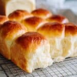 This classic Milk Bread recipe yields soft, fluffy, and slightly sweet bread with a tender crumb and a beautiful golden crust. Made with simple ingredients like milk, heavy cream, and sugar, this versatile bread is perfect for sandwiches, toast, or just enjoying plain. The dough is kneaded until smooth, proofed twice to develop its delicate texture, then baked to a golden finish and brushed with a simple syrup for extra shine and sweetness.