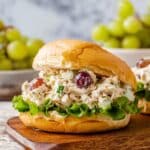 A creamy and flavorful chicken salad featuring tender diced chicken breast, crisp celery, juicy red grapes, and crunchy slivered almonds, all combined with whipped heavy cream and mayonnaise for a light, fluffy texture. Perfect for sandwiches, wraps, or as a standalone salad.