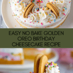 Keywords: No bake cheesecake, birthday cake, funfetti cheesecake, Golden Oreo crust, vegan cheesecake option, easy dessert, Oreo cheesecake