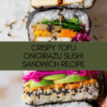 Keywords: onigirazu, sushi sandwich, tofu katsu, sweet potato katsu, vegan sushi, Japanese lunch, pickled cabbage, sushi rice, nori wrap