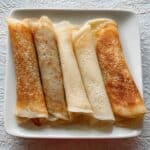 - Assemble the Patishapta: Place a portion of the cooled khoya filling lengthwise on each crepe. Fold the crepe from both sides to form a roll that encloses the filling completely. Arrange the rolls on a serving dish.
