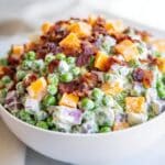 Keywords: pea salad,bacon pea salad,cheddar pea salad,creamy pea salad,cold pea salad,summer side dish,salad with bacon,pea salad recipe