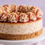 This recipe doesn’t require a water bath. Baking slowly at a lower temperature after an initial high heat helps prevent cracks while keeping the cheesecake creamy.