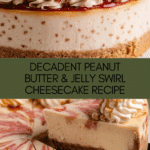 This Peanut Butter & Jelly Cheesecake combines the classic flavors of a beloved sandwich with a rich, creamy dessert. With a graham cracker crust, smooth peanut butter filling, and swirls of strawberry topping, it’s a delightful treat for any occasion.