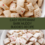 Keywords: peppermint bark muddy buddies, peppermint bark snack, muddy buddies recipe, Rice Chex cereal treat, holiday snack, no-bake peppermint dessert