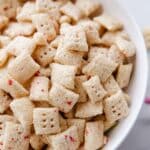 Keywords: peppermint bark muddy buddies, peppermint bark snack, muddy buddies recipe, Rice Chex cereal treat, holiday snack, no-bake peppermint dessert