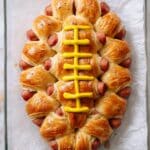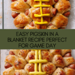 Pigskin in a Blanket is a fun and tasty appetizer perfect for game day or any casual gathering. Mini hot dogs are wrapped in flaky crescent rolls and baked to golden perfection, then decorated to look like a football for a playful presentation.