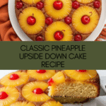 This classic Pineapple Upside Down Cake features a caramelized brown sugar and butter topping adorned with juicy pineapple slices and maraschino cherries, topped with a moist, fluffy cake infused with pineapple juice and vanilla. Perfect for a nostalgic dessert that combines fruity sweetness and buttery richness.
