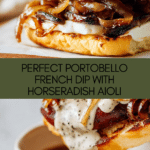Keywords: Portobello French Dip, Vegetarian French Dip, Mushroom Sandwich, Horseradish Aioli, Caramelized Onions, Au Jus, Sourdough Sandwich
