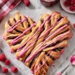 - Make and drizzle glaze: In a small bowl, whisk together the confectioners’ sugar, raspberry jam, whole milk, and 1 to 2 drops of pink food coloring, adjusting color intensity as desired. Drizzle this glaze evenly over the cooled heart, letting it drip elegantly over the twists.
