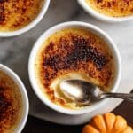 This Pumpkin Creme Brulee recipe offers a luscious blend of creamy custard enriched with the warm flavors of pumpkin and pumpkin spice. Perfect for fall, this classic French dessert is baked in a water bath to achieve a smooth, velvety texture and finished with a crisp caramelized sugar topping using a kitchen torch.