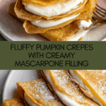 These Pumpkin Crepes are a deliciously spiced, tender crepe filled with creamy mascarpone and pumpkin flavors. Perfect for a cozy fall breakfast or dessert, this recipe combines browned butter and warm cinnamon with pumpkin puree and a smooth mascarpone filling sweetened with powdered sugar. Made on the stovetop, these crepes are light, fluffy, and ideal for layering or folding with luscious mascarpone cream.