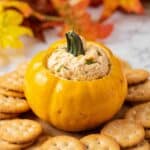 Store the pumpkin cheese ball wrapped tightly in plastic wrap in the refrigerator for up to 5 days. Before serving, let it sit at room temperature for about 15 minutes to soften slightly. If needed, refrigerate leftovers promptly.