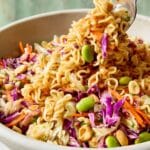 A crunchy and vibrant ramen noodle salad combining toasted ramen noodles, peanuts, and sesame seeds with a tangy and sweet rice vinegar dressing. Tossed with shredded green and red cabbage, edamame, carrots, scallions, and fresh cilantro, this refreshing salad delivers layers of texture and flavor perfect for a make-ahead dish or side.