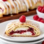 This Raspberry Breakfast Braid is a delightful pastry combining creamy lemon-tinged cream cheese and sweet raspberry pie filling wrapped in buttery crescent roll dough braided to perfection. Topped with a luscious lemon glaze, it makes a beautiful and delicious breakfast or brunch treat that’s easy to prepare and impressive to serve.