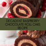A decadent Raspberry Chocolate Roll Cake featuring a moist chocolate sponge rolled with a tart raspberry filling and rich chocolate whipped cream. This elegant dessert is finished with a silky chocolate ganache and fresh raspberries, perfect for special occasions or impressing guests.