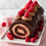A decadent Raspberry Chocolate Roll Cake featuring a moist chocolate sponge rolled with a tart raspberry filling and rich chocolate whipped cream. This elegant dessert is finished with a silky chocolate ganache and fresh raspberries, perfect for special occasions or impressing guests.