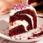 Keywords: Red Velvet Cake, Bundt Cake, Cream Cheese Swirl, Dessert, Cake with Glaze, Celebration Cake