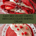 These Red Velvet Crepes are a decadent twist on the classic French crepe, infused with cocoa and vibrant red food coloring for a striking appearance. Filled with a luscious chocolate whipped cream and fresh strawberries, they make an elegant dessert or a special breakfast treat. Soft, thin crepes layered with rich whipped cream and fruit create a perfectly balanced sweet indulgence.