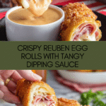 These Reuben Egg Rolls are a delicious twist on the classic deli sandwich, featuring tender corned beef, melted Swiss cheese, and tangy sauerkraut all wrapped in crispy egg roll wrappers and fried to golden perfection. Served with Thousand Island dressing for dipping, they make a perfect appetizer or savory snack.