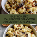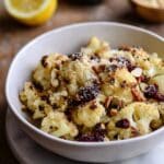 A vibrant Roasted Cauliflower Salad featuring tender, golden-brown cauliflower florets tossed with dried cranberries, toasted almonds, and Parmesan cheese, all dressed in a tangy and sweet lemon-Dijon vinaigrette. This salad is a perfect balance of roasted flavors, crunch, and bright acidity, making it a delicious side dish or light meal.
