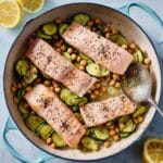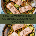 This Salmon with Olive Oil-Braised Zucchini and Chickpeas is a light, flavorful dish perfect for a weeknight dinner. The tender salmon pairs beautifully with the garlicky zucchini and hearty chickpeas, all brightened by fresh lemon.