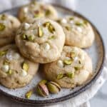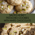 Keywords: Salted Honey Pistachio Cookies, browned butter cookies, pistachio cookies, honey cookies, white chocolate chip cookies, sweet and salty cookies