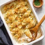 - Assemble Casserole: Grease a casserole dish and pour ½ cup of the white sauce on the bottom. Scoop the seafood filling into each cooked pasta shell and arrange the stuffed shells in the casserole.