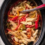 - Combine Chicken and Vegetables: Drain most of the liquid from the slow cooker to avoid sogginess, then return the sliced chicken strips back into the slow cooker to toss and mix together thoroughly with the cooked peppers and onions.
