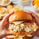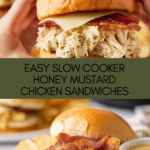These Slow Cooker Honey Mustard Chicken Sandwiches feature tender, shredded chicken slow-cooked in a tangy honey mustard sauce, then served with Swiss cheese and crispy bacon on toasted sandwich rolls for a satisfying and flavorful meal that’s effortless to prepare.