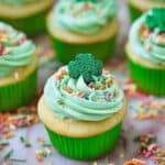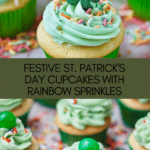 Keywords: St. Patrick’s Day cupcakes, vanilla cupcakes, festive cupcakes, buttercream frosting, rainbow sprinkles, holiday dessert